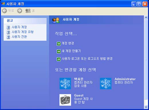 계정 관리 실행 방법 : 시작 → 제어판 → 사용자 계정