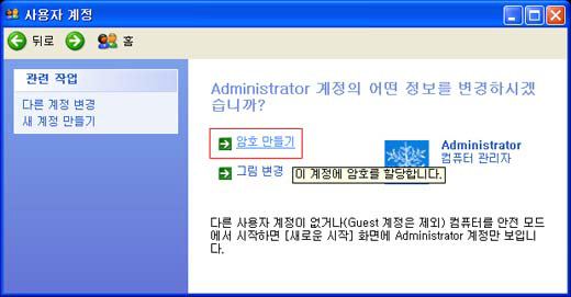 사용자 계정 관리에서는 관리자인 Administrator의 암호를 다시 설정할 수 있는 기능을 추가로 제공한다.