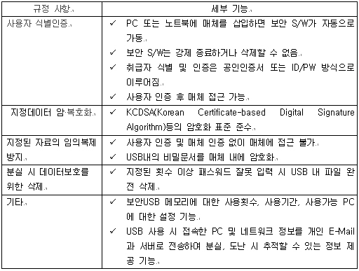 국정원 보안 요구기준을 갖추기 위한 보안USB 세부 기능은 다음과 같이 정의할 수 있습니다.