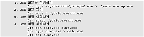 다음은 "명령 프롬프트" 상에서 ADS 조작할 수 있는 명령으로, 여기에서 예로 들고 있는 것은 윈도우 계산기 프로그램에 노트패드를 ASD로 붙였다가 제거하는 방법이다.