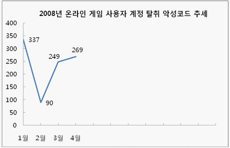 온라인 게임의 사용자 계정 정보를 탈취 하는 악성코드 유형은 전월 대비 8% 증가 비율을 보였다. 비록 소폭 증가한 형태이나 5월에는 그 수가 4월 보다 증가 할 것으로 보인다. 그러한 이유는 SQL 서버의 취약점을 공격하여 이러한 유형의 악성코드를 업로드 한 URL 을 취약한 SQL 서버내 htm 파일에 자동으로 IFRAME 태그를 삽입하는 공격 도구가 발견되었기 때문이다. 이를 악용하여 수만개의 웹 페이지가 공격을 받아 해킹된 것으로 보고 되었으며, 이러한 웹 페이지를 통하여 악성코드 제작자가 손쉽게 해당 트로이목마를 제작하여 배포 할 수 있기 때문에 5월에 해당 악성코드 수는 증가 할 것으로 추정 된다.