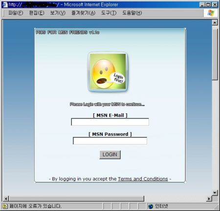 여기에 정보를 입력하면 누군가가 본인의 이메일과 비밀번호로 MSN에 로그인해 대화 상대에게 같은 수법으로 정보를 입력하게 합니다. 이는 MSN 계정 수집을 목적으로 한 일종의 피싱 페이지라 할 수 있습니다.