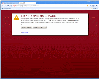 파이어폭스 3 에서는 해당 페이지를 [그림 12]와 같이 차단하였으며 해당 페이지를 차단한 이유와 현재 상태를 [그림 13]과 같이 사용자가 직접 확인할 수 있다. 특이할 만한 사항은 해당 페이지의 데이터베이스를 구글이 제공했다는 것이다. 따라서 크롬 역시 같은 데이터를 사용할 것이라고 추측할 수 있다.
