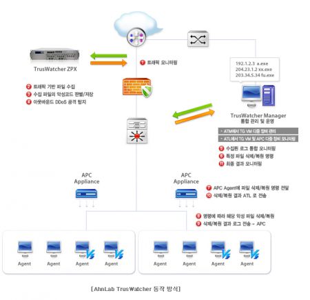 또한 ‘트러스와처’는 안철수연구소의 매니지먼트 솔루션인 APC 어플라이언스와 연동해 악성 파일을 삭제하는 기능도 제공한다. PC를 좀비화하는 악성코드 및 디도스 행위의 수집–분석–모니터링–대응에 이르는 종합적인 프로세스를 구축하는 셈이다.