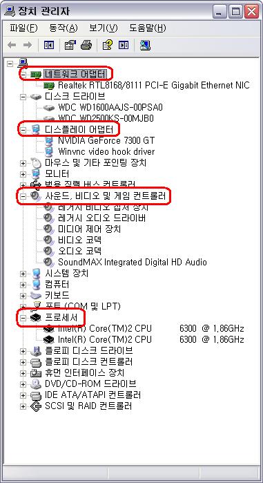 장치 관리자를 클릭하면 현재 내 시스템에 설치된 하드웨어들에 대한 정보들을 볼 수 있는 다음 [그림 1-3] 의 화면이 나타난다.