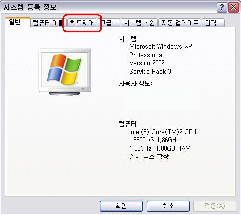 [Windows 키] + [Pause Break] 키를 누르거나, 내 컴퓨터 아이콘에서 마우스 오른쪽 클릭을 하여 나타나는 메뉴에서 속성(R)을 클릭, 또는 제어판에서 ‘시스템’ 항목을 더블 클릭하면 다음과 같은 창이 나타난다.