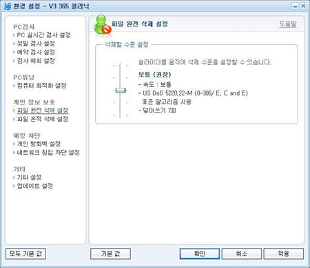 ‘설정하기’ 버튼을 눌러서 환경 설정 화면에 들어가면, 삭제할 수준을 설정할 수 있는 메뉴가 나타난다. 말 그대로, 어느 정도로 완벽하게 파일 및 파일의 흔적을 삭제할 것인지를 선택할 수 있는 메뉴로서, 슬라이더를 조정하여 사용자가 선택할 수 있는 수준들은 다음과 같다.