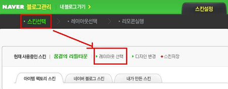 2. 이제 네이버 블로그로 갑니다. 로그인 하신 후 [블로그관리]-[스킨선택]-[레이아웃선택]으로 들어갑니다.