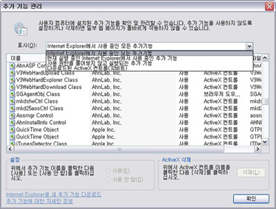 추가 기능 관리 창 상단의 풀다운 메뉴 선택을 통해 여러 가지 방식으로 설치된 기능들을 확인 할 수 있다. 사용을 원하지 않거나 필요가 없다고 생각되는 기능들의 경우, 간단히 해당 항목을 선택한 후 ‘사용 안 함’ 란에 표시해주면 해당 기능이 사용 해제가 된다. ActiveX 컨트롤의 경우에는 삭제하는 것도 가능하다.